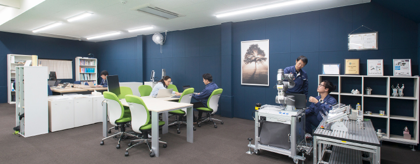 ロボットのティーチングや周辺設備などを含めた設計を行い、生産現場の自動化を提案します。最先端のロボティクス技術を体感できるラボにて導入シミュレーションを実施することも可能です。